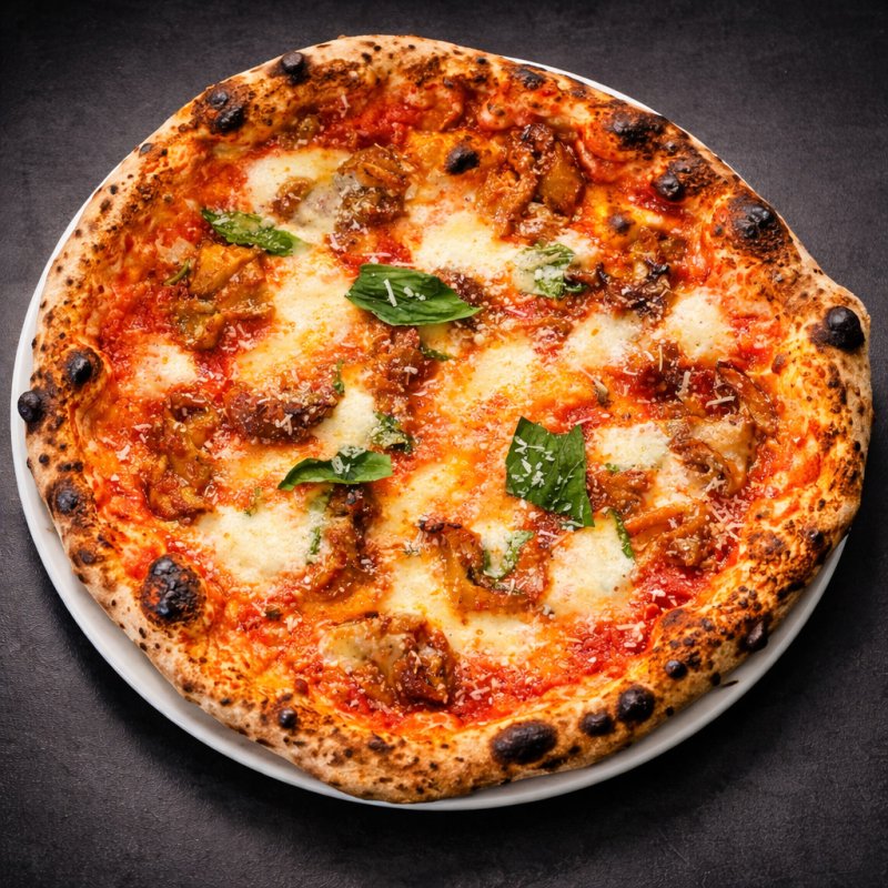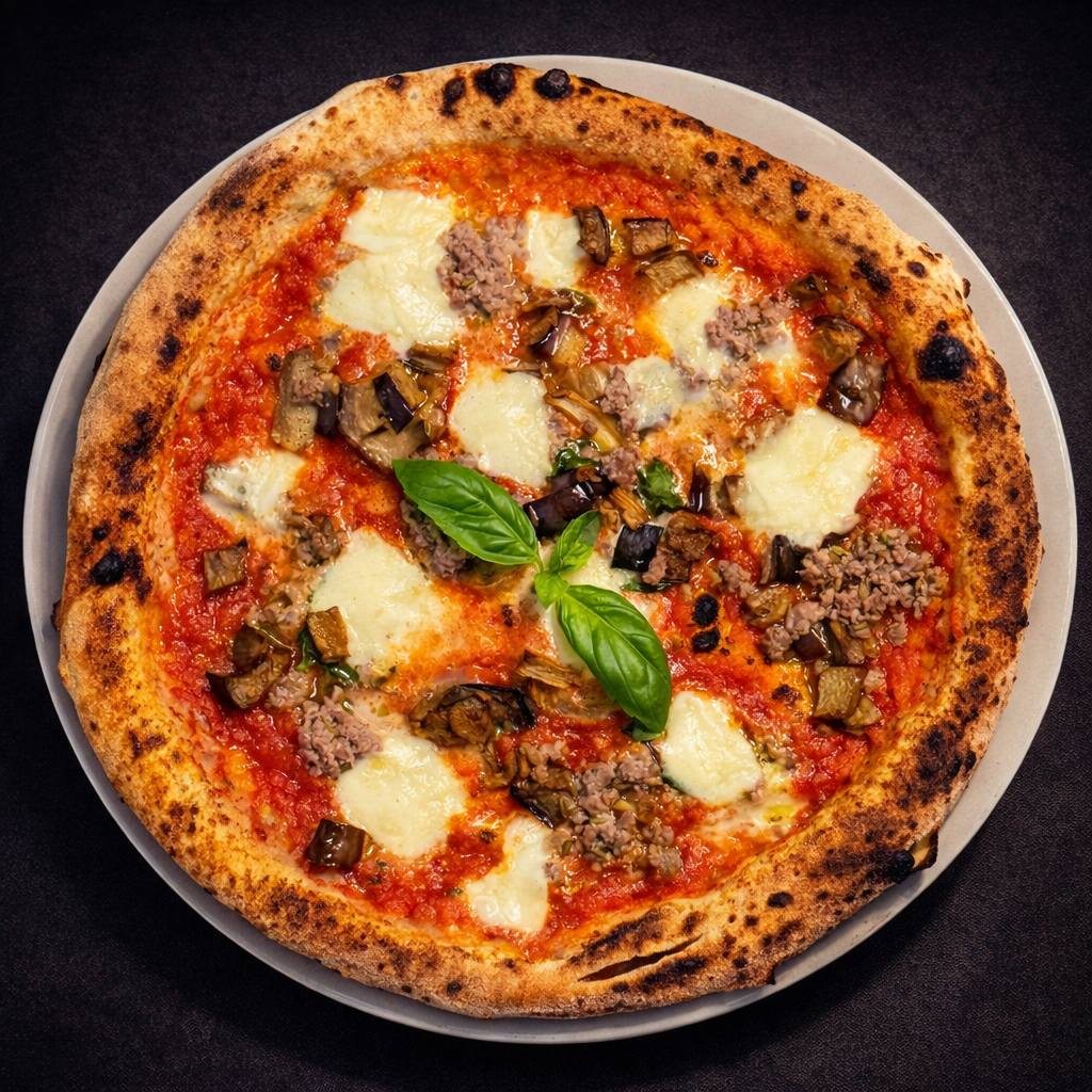 Tomate San Marzano, Mozarella di Bufala, Aubergines, Parmesan, Saucisse, Basilic