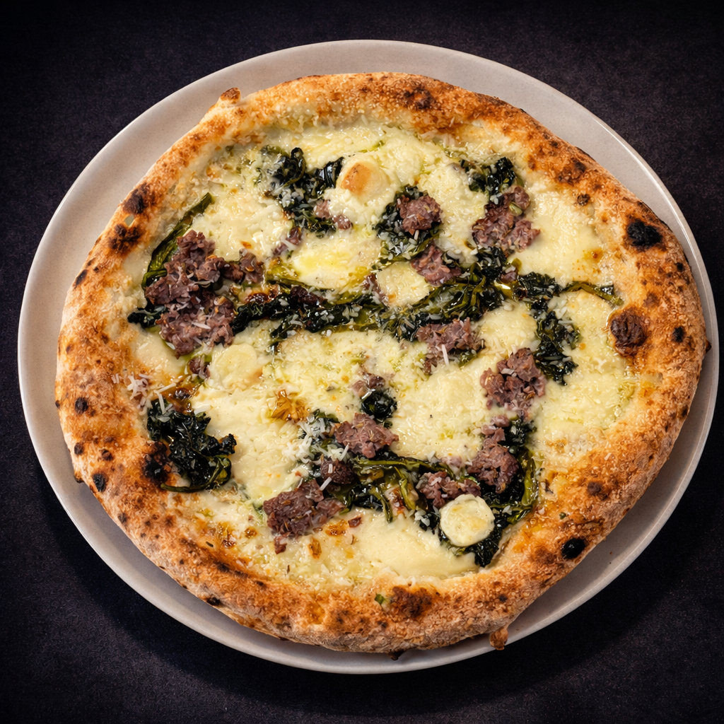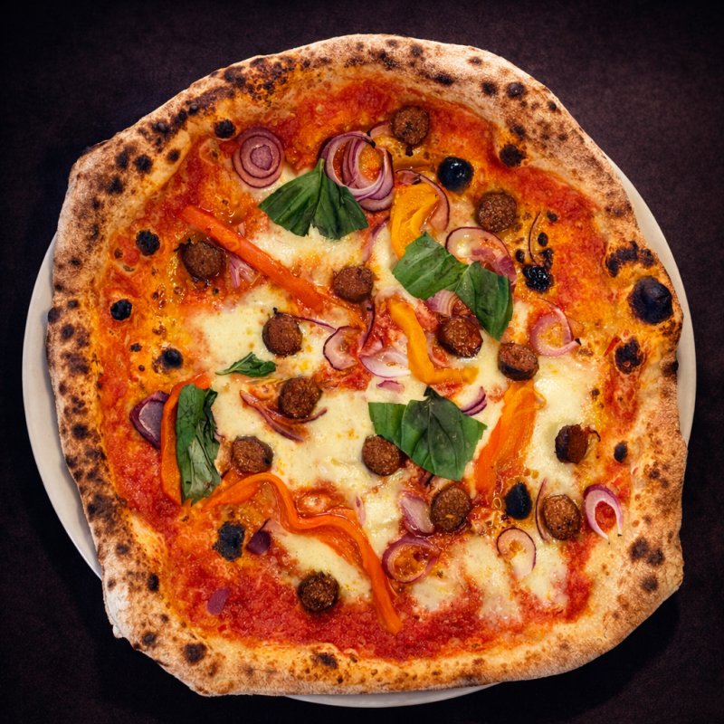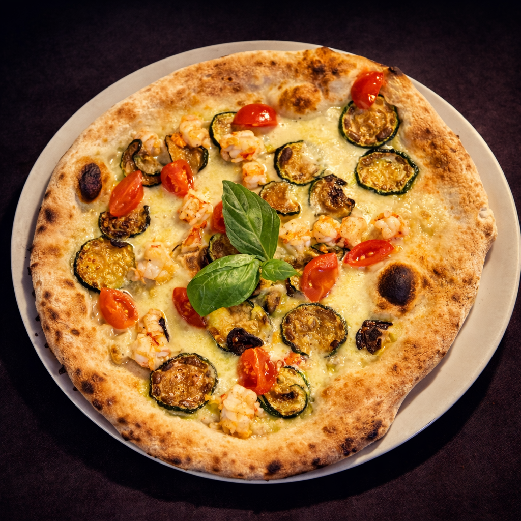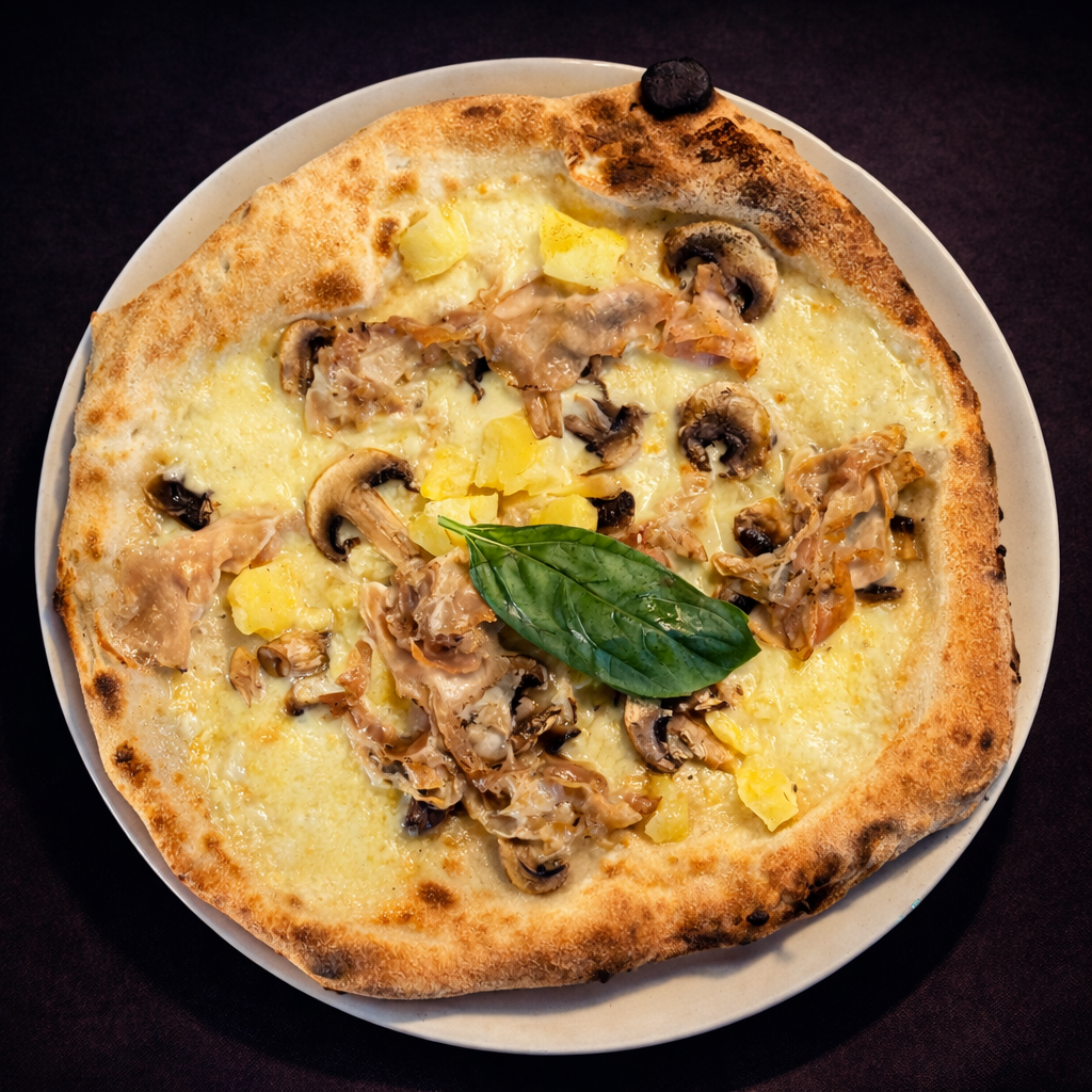 Porchetta, Fior di latte, Pommes de terre, Champignons, Basilic, Huile EVO