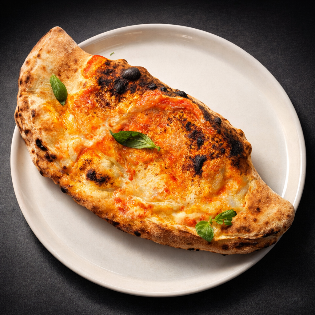 Pizza fermée avec Tomate San Marzano, Fior di latte, Jambon cuit, Champignons