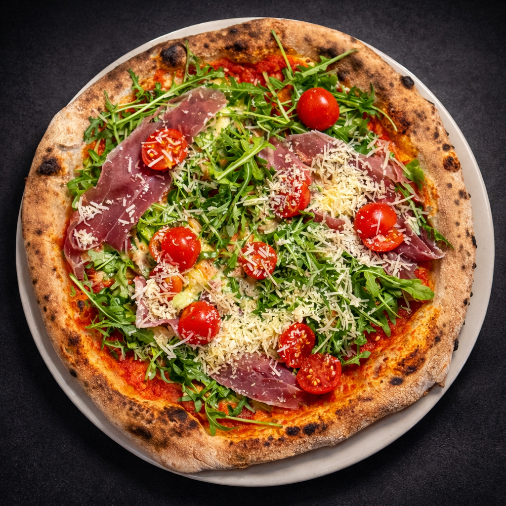 Tomate San Marzano, Fior di latte, Parmesan, Jambon San Daniele, Tomates cerises, Roquette