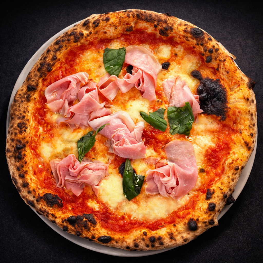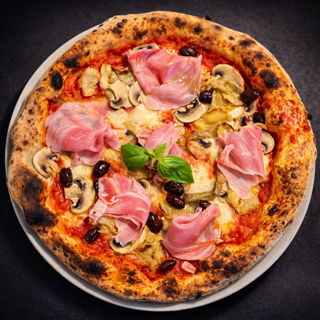 Tomate San Marzano, Fior di latte, Jambon cuit, Champignons, Olives, Artichauds