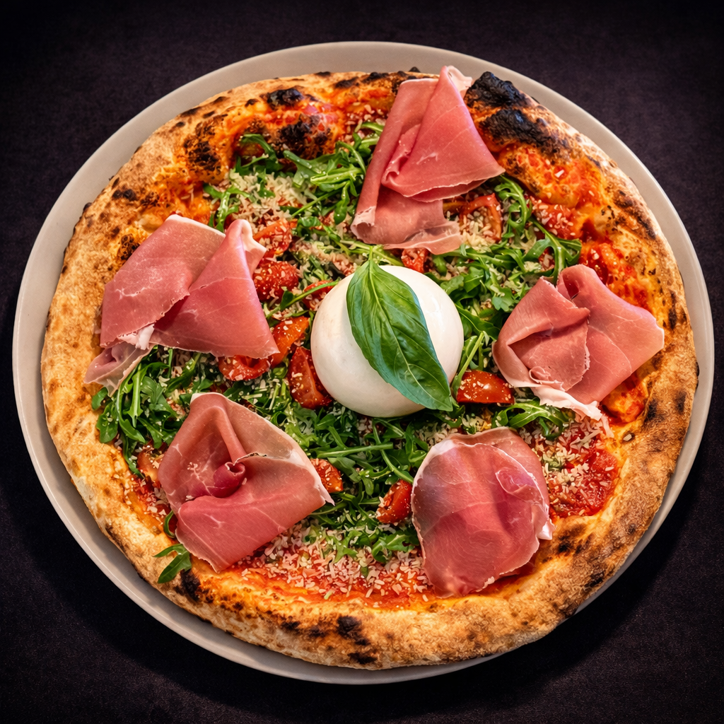 Tomate San Marzano, Parmesan, Roquette, Aïl, Burrata. Tomates cerises, Jambon San Daniele