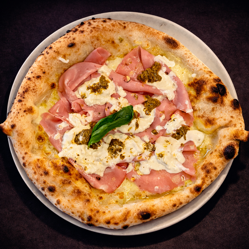 Mortadelle, Fior di latte, Crème de pistache, Burrata, Basilic, Huile EVO